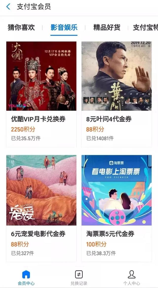 比如娱乐方面,所有VIP会员都可以兑换积分,最近比较流行的《叶问4》代金券,或者直接淘宝电影代金券...