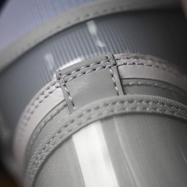灰色漆皮配白色皮质,鞋面和鞋跟透明材质,白色飞翼logo装饰,高品质,动感前卫。