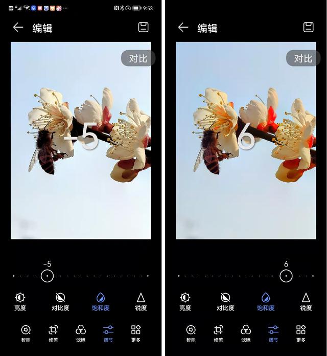 华为图库图片编辑中可以调整图片颜色的图标有饱和度和色温。饱和度越大,画面颜色越亮,反之越暗。