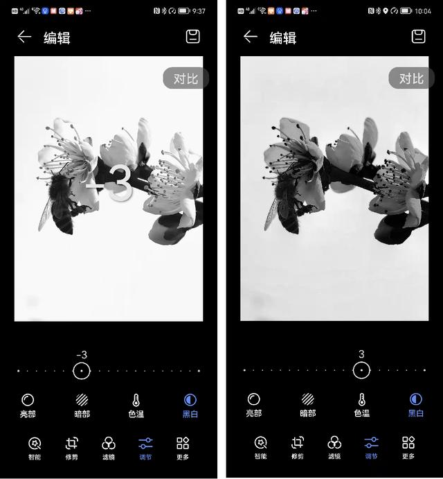 此外,黑白图标可以将彩色照片变成黑白照片,左侧调整画面越亮,右侧调整画面越暗。