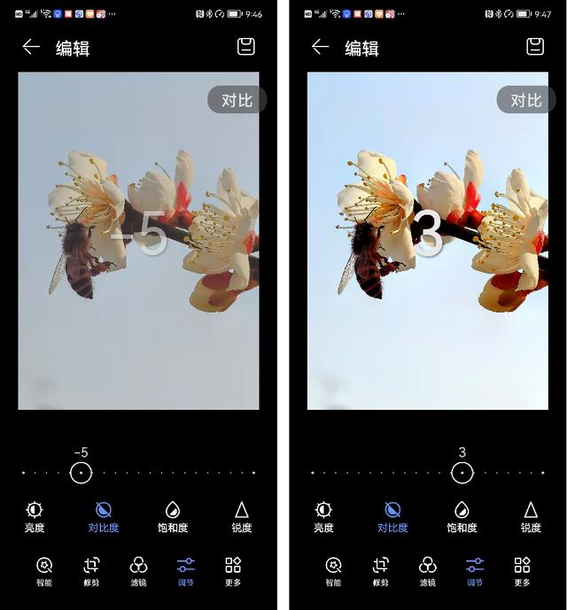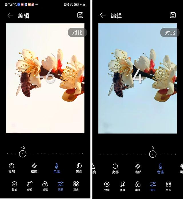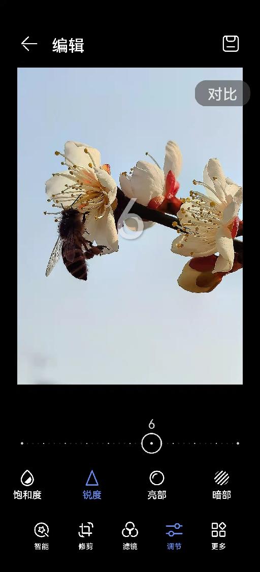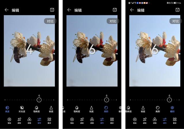 华为图库图片编辑有三个方面可以调节图片的亮度,分别是亮度、亮部和暗部。点击调整图标进入调整页面,其中第一个图标为亮度,第五、六个图标为明暗部分。亮度是调节整个画面的亮度,亮部是调节画面高亮部分的亮度,暗部是调节画面阴影部分的亮度。