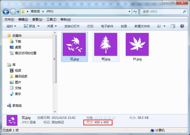 3.稍等,PS软件会自动处理所有图片。打开“修改”文件夹,可以看到里面已经生成了一个“JPEG”文件夹。双击打开“JPEG”文件夹,可以看到所有修改大小的图片。选择图片,在窗口下方的图片信息中可以看到,图片尺寸已经变成了“400×400”。