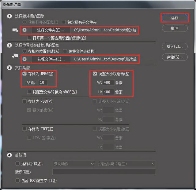 在“③文件类型”下选择“另存为JPEG”,根据需要设置图像质量,这里设置为“10”,勾选“调整大小以适合”,设置图像宽度“W”为“400”像素,设置图像高度“H”为“400”像素;