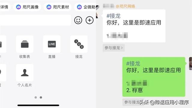 打开企业微信客户群,点击底部的接龙,即可推出群接龙。微信客户可以快速参与接龙,更快的注册活动和收集信息。
