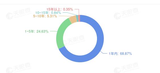值得注意的是,根据天眼调查的数据,68.87%的教育相关企业成立于最近一年内,24.63%成立于一至五年内,只有52225家(6.5%)的经营时间超过五年。