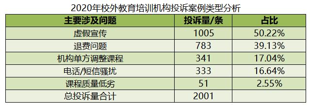 中消协发布的《2020年全国消协组织受理投诉情况分析》显示,2020年,全国消协组织受理教育培训服务投诉56165件,其中合同纠纷24153件,售后服务纠纷18048件,虚假宣传纠纷3553件,服务质量纠纷3200件,价格纠纷2961件。