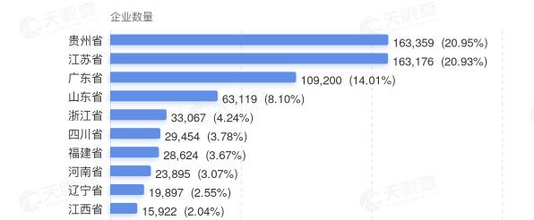 从地域分布来看,贵州有相关企业163359家,占全国的20.95%。江苏紧随其后,相关企业163176家,占比20.93%;广东相关企业10.92万家,占比14.01%。可以看出,超过一半的内地校外教育培训企业都集中在这三个省份。