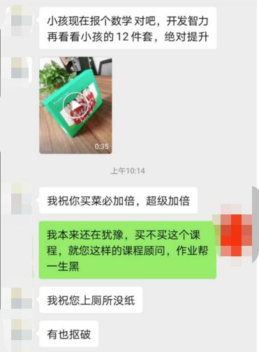 有家长在孩子开学后接到培训机构推销课程的电话。抱着先了解的心态,他们加了课程顾问的微信。因为工作太忙,暂时没有回复,但是回复对方微信的时候被对方大骂,比如“祝你上厕所没纸”等。这些聊天让家长不舒服,要求相关机构道歉。后续机构在回复中表示,这些不是公司内部人员,而是不明地方的渠道推广。消费者认为培训机构应该多下功夫规范内部管理,而不是投入那么多钱打广告。