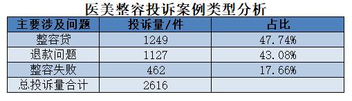 对此,杜南民调中心消费者生活监测榜单课题组(以下简称“课题组”)对医美美容行业相关投诉进行了监测分析。本文以研究者自有平台如杜南热线、21cn投诉收集平台、投诉直通车平台、黑猫投诉平台的投诉数据为基础,对2015年1月1日至2021年7月8日的2616例医疗美容手术相关投诉进行了汇总分析。分析结果显示,近50%的投诉人遇到整容贷款,40%遇到退款问题,近20%反映自己整容失败。(详见下表)