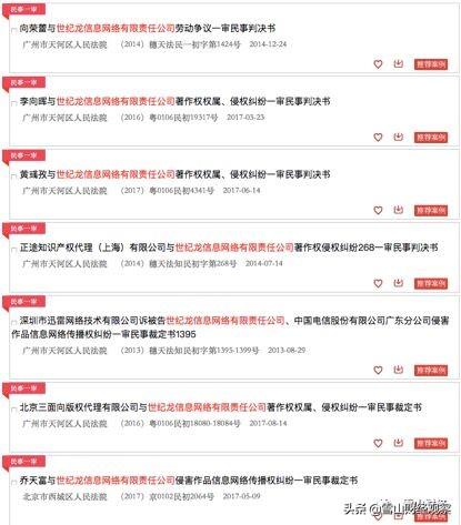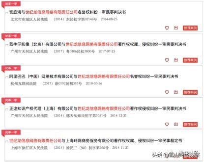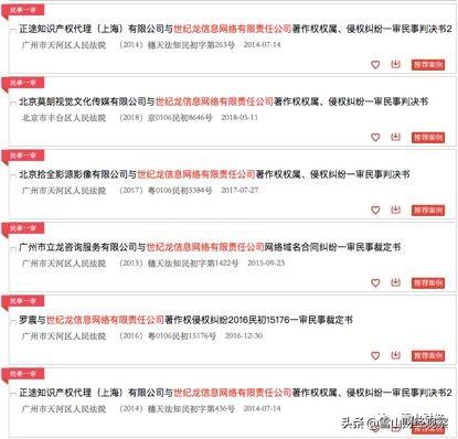 据初步统计,世纪巨龙信息网络有限公司涉及的诉讼中,约90%是著作权侵权,至少2起劳动争议诉讼,至少3起名誉诉讼。原告中不乏著名的阿里巴巴和人民网。