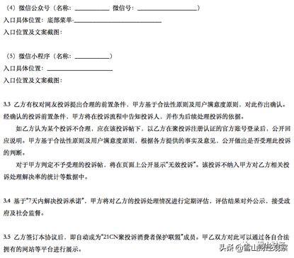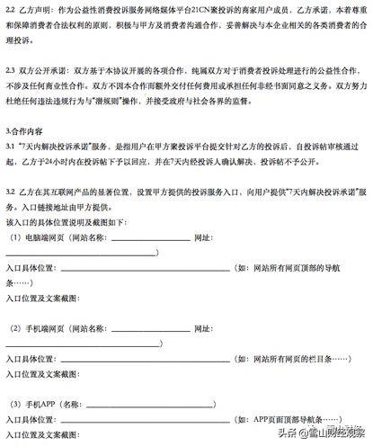 3.2乙方应在其互联网产品的显著位置设置由甲方提供的投诉服务入口,并向用户提供“承诺7天内解决投诉”的服务。入口地址由甲方提供..