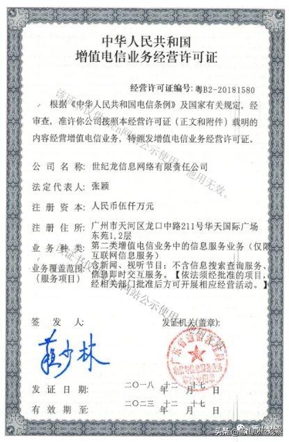 根据国家企业信用信息公示系统,世纪龙信息网络有限公司的经营范围为“在广东省内提供互联网接入服务;信息服务(仅互联网信息服务,包括公告栏服务);虚拟主机服务、托管服务;系统集成和项目咨询服务计算机产品的开发和销售等。“不包括受理和处理网络投诉或类似业务。