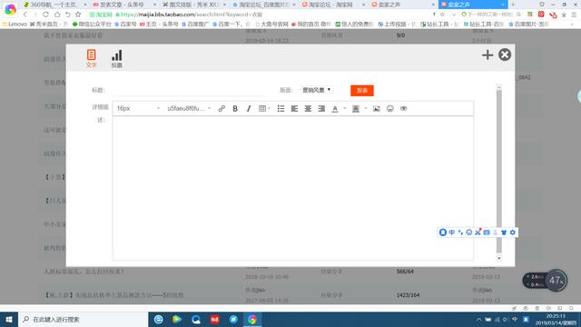 淘宝发帖操作:论坛发帖:登录论坛首页,选择版面,论坛内容:撰写,发布成功,分享推广,申请帖子细化:细化规则:标题内容与帖子内容一致,帖子不能包含广告,帖子内容需原创。