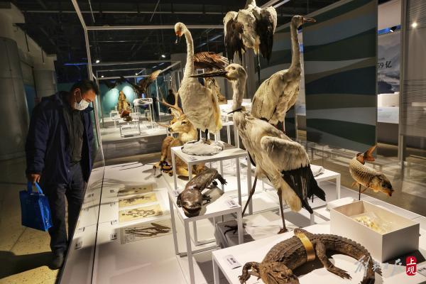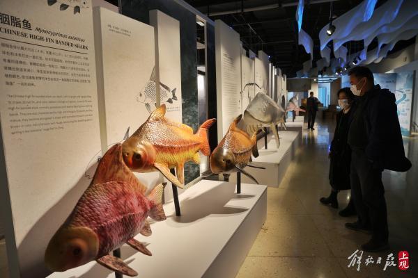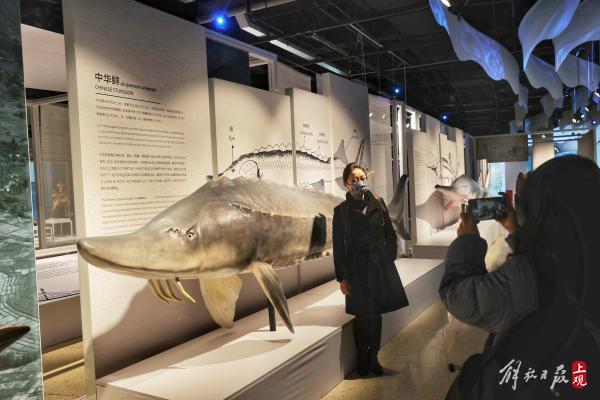 在展览中,大型长江珍稀鱼类模型——国家一级保护动物中华鲟、中华鲟和胭脂鱼,真实还原了现场记录的三个物种的最大尺寸,其中中华鲟7米,中华鲟5米,胭脂鱼1.4米,让观众看到了长江渔民口中“中华鲟千斤,大象万斤,黄排大得不可思议”的原貌