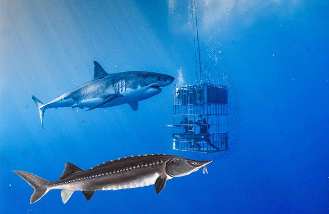 (图片说明:最长的欧洲鲳鲹和大白鲨的对比)