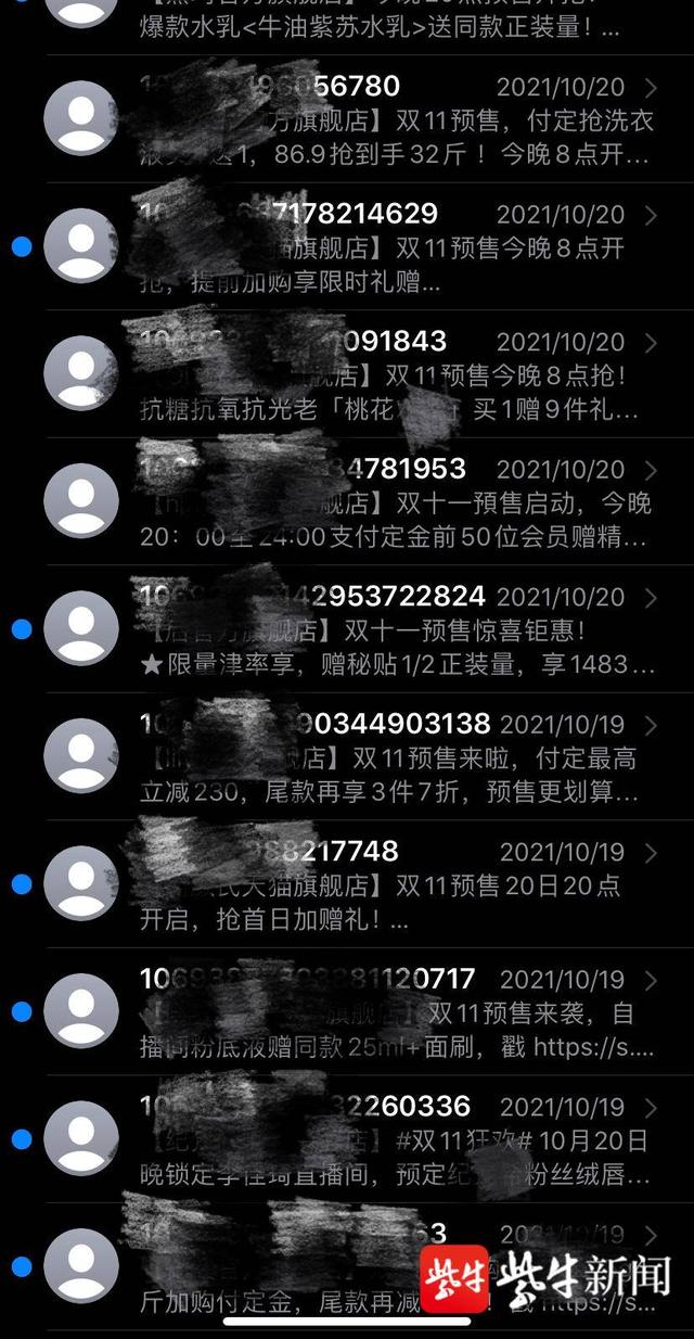 “10月19日到20日,店里发的短信有20多条。”李女士向记者展示了自己的短信记录,基本都是双十一短信刷屏的。发短信的店铺都是李女士下单的店铺。"到目前为止,有超过60条这样的短信,它们经常淹没了重要的信息."更让她头疼的是,这些短信的发送时间并不固定,她经常在夜里12点收到短信。