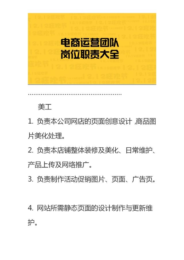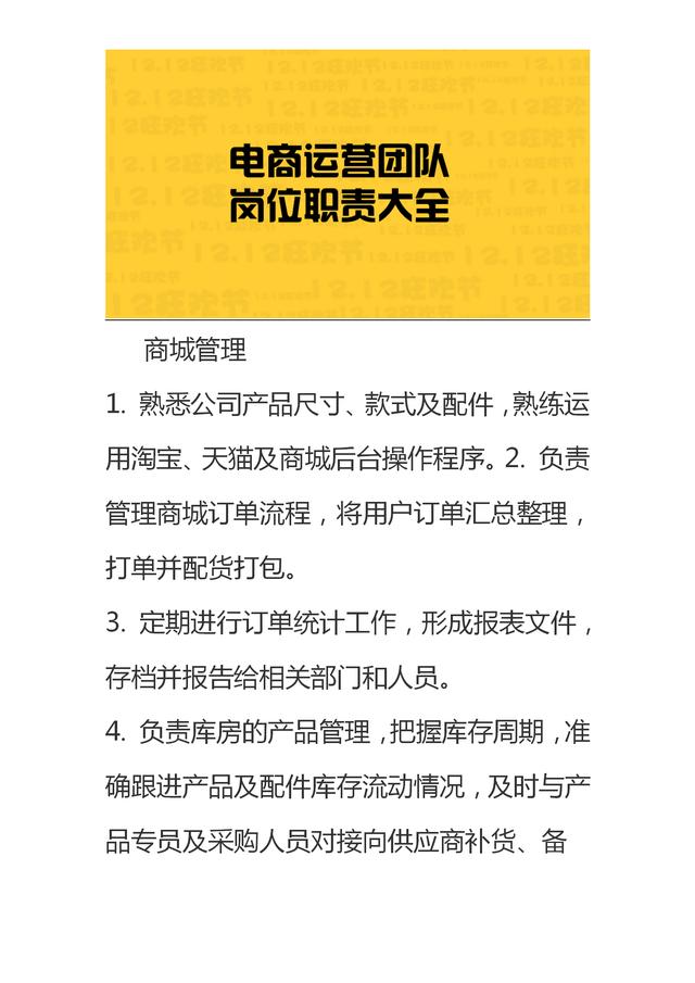 电商平台运营岗位职责(电商运营团队岗位职责大全:美工、编辑、运营主管等一应俱全) 编辑柚子 2022-04-20 11:52:12 [提示]这份资料一共23页,我们已经整理成电子文档给你。如果你认为这些信息对你有帮助希望得到完整的电子内容参考学习。可以关注+收藏+转发。然后私信:0902 电商平台运营 您可以还会对下面的文章感兴趣 电商平台运营管理(电商平台商品管理及治理的策略体系) 电商平台运营管理制度(《浙江省电子商务条例》3月1日起正式实施) 电商平台运营需要分析哪些数据(电商平台应该分析哪些数据?具体怎么去分析?) 电商平台运营方案计划(电商运营:4步做好用户运营) 电商平台运营方案思路(最全面的电商运营方案:从0到1入门店铺整改方案建议) 相关文章: 俊平大魔王公司叫什么(俊平大魔王:从IT业跨界到美妆圈,论一个产品经理的创业之路) 新创互联张小攀(【新人入行】电商运营到底有没有前途?) 新创电商(从“受害者”到“诈骗犯”!这个诈骗1.31亿元的犯罪集团被判了) 摩拜单车创始人(摩拜“套现”15亿后,创始人胡玮炜搭档原班人马再度创业!) 张川简历(电商“鬼才”张川,少有人知,京东阿里也留不住他?) 飞凡电商(飞凡宣告注销,王健林为何做不成电商) 万达线上平台(万达旗下电商平台新飞凡正式注销 王健林“电商梦”断) 万达电子商务有限公司(做不过马云!王健林梦碎电商:消失三个月资产缩水接近一半)