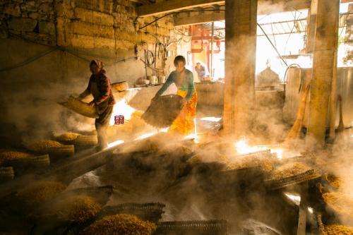一般来说,无论是机器酿造还是人工酿造,通常都有几个步骤,分别是蒸、投酒曲、发酵,最后蒸馏。