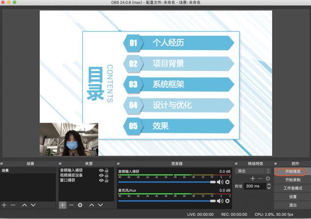 4)设置后,可以调整整个窗口的比例。确认效果后,先点击obs中的推流。
