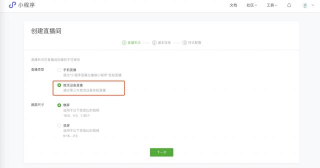 2)选择直播类型为设备流直播(流直播需要直播组件版本1.0.3及以上支持)