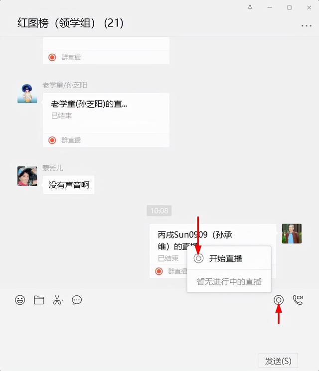 点击要直播的微信群发布窗口右侧的“直播”按钮。