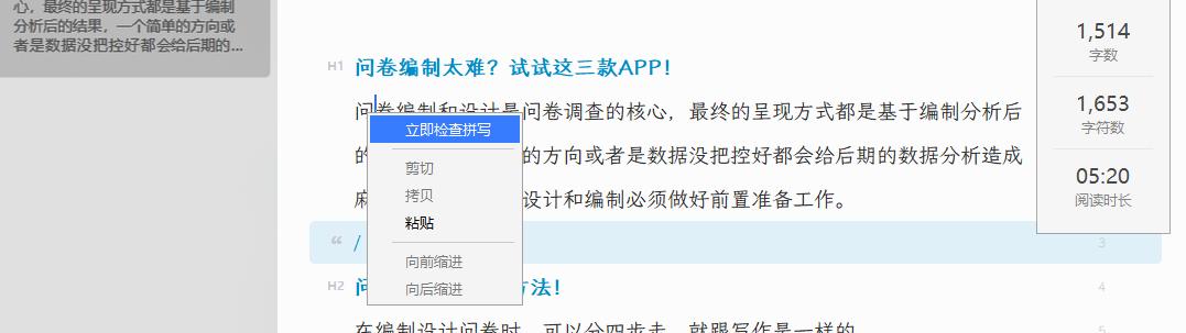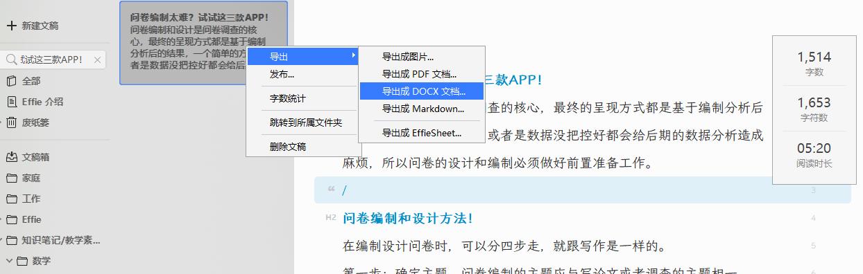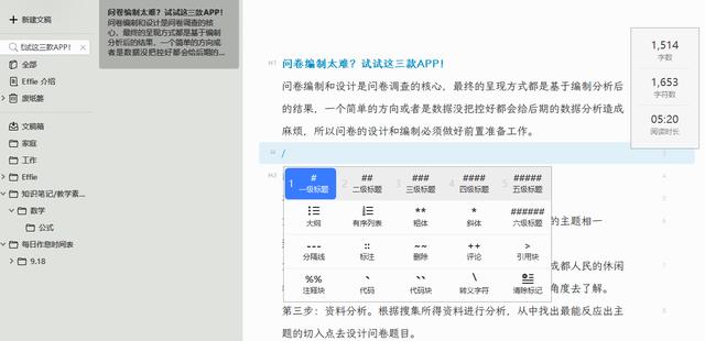 艾菲是我们主推荐的软件,集自由写作、极简大纲和思维导图、便携笔记于一体。也就是说,文本内容部分可以混编极简大纲,一段文字,一段提纲分析,在设计和编制问卷题或后调查问卷题时,可以一目了然。不需要在结构化工具和编写工具之间来回切换。对于这一点,艾菲完美抓住了用户的痛点。
