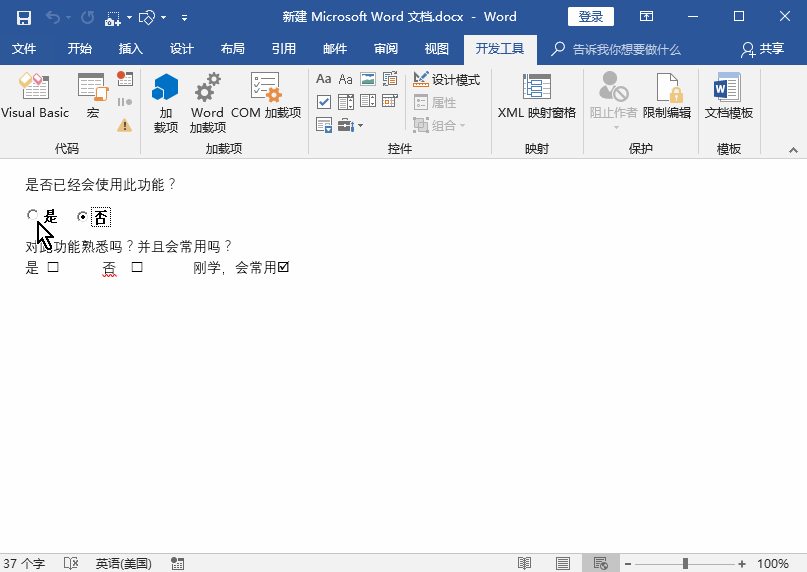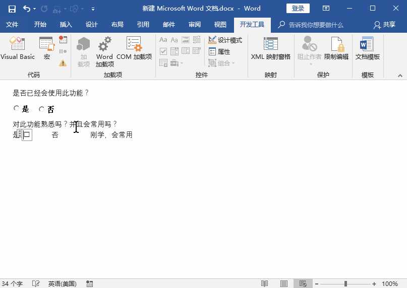 5.甚至有些问题需要使用复选框,也是同样的道理,只不过他把内容分开,写几个答案用空占空格,然后点击【开发工具】-【复选框内容控制】;