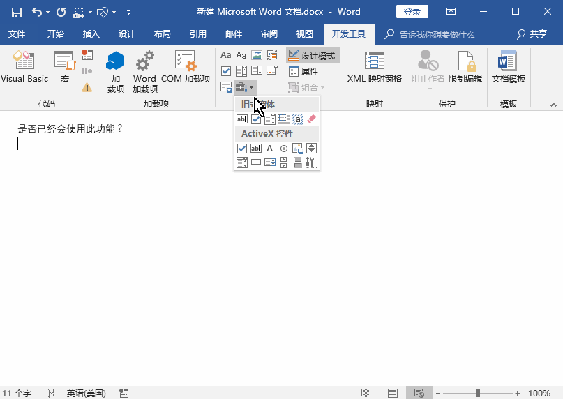 4.退出设计模式,点击[开发工具]-[设计模式]。此时设计模式由浅蓝色背景变为无色背景,证明已经退出;