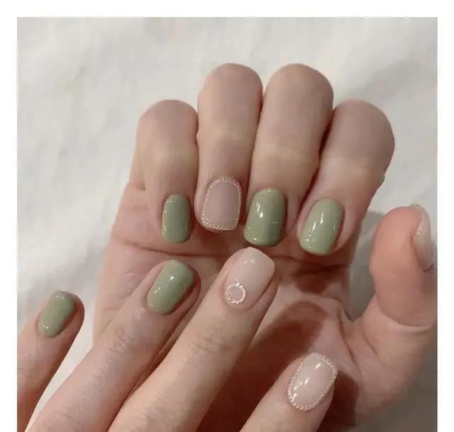 绿色配色更适合鲜艳的美甲,雾蒙蒙的表面上的封层会给人一种“灰秃秃”的感觉,反而会失去少女的超然和清新。如果喜欢简约大气的风格,可以简单的用纯色风格来配色,不需要琐碎的配饰。