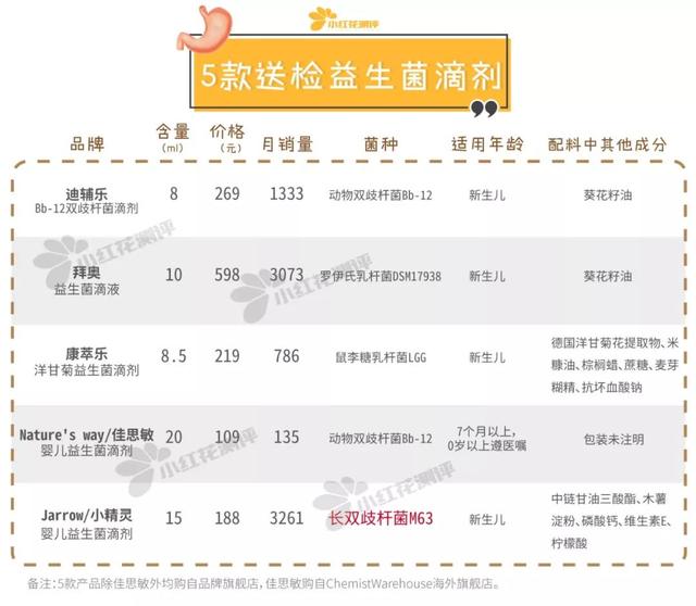 参考平台的销量和品牌知名度,在小红花的终评中选择了以下五款益生菌滴剂进行考察: