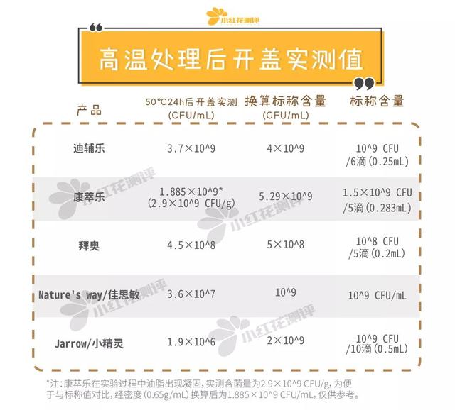 所有产品的活菌数均低于标示值,也低于另一组未经高温处理的产品的初始开启值。