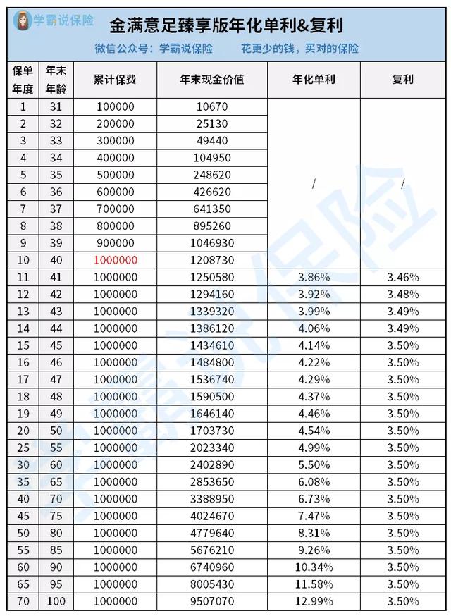 接下来,我们来看看黄金满意版不减保的年化单利和复利表现。