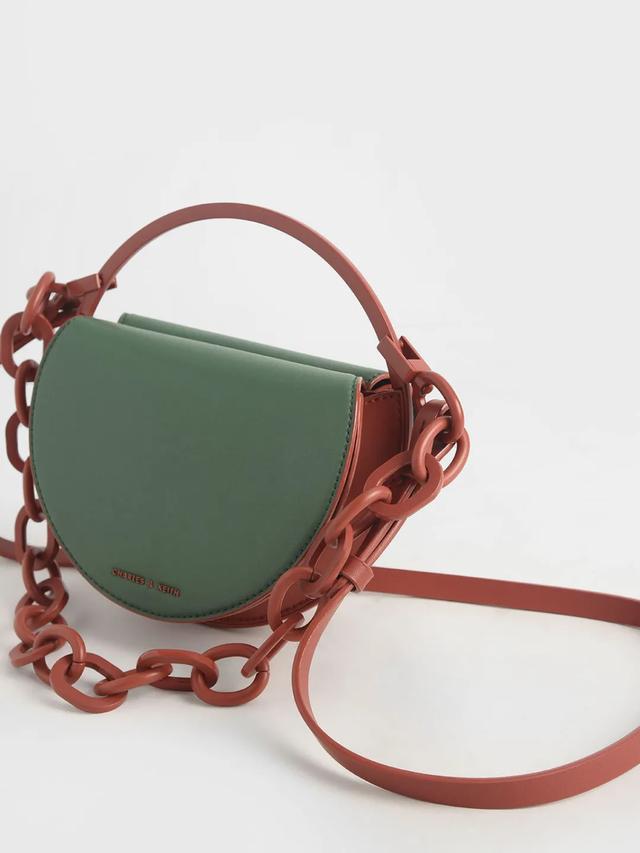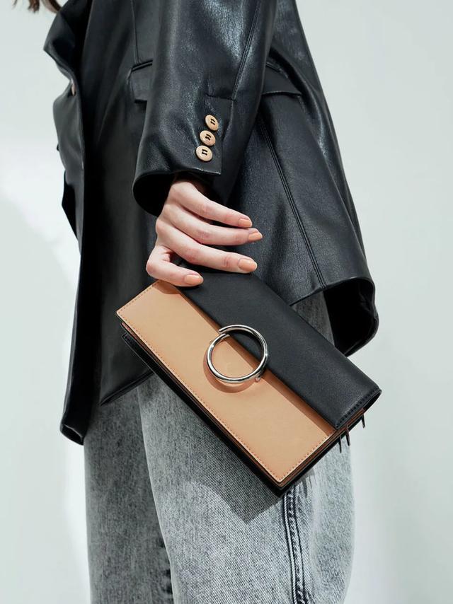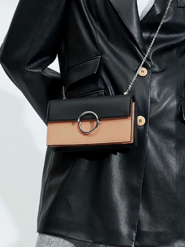 黑色和裸色的搭配营造出强烈的视觉效果,再配上银色金属环的点缀,包包的时尚感瞬间倍增。