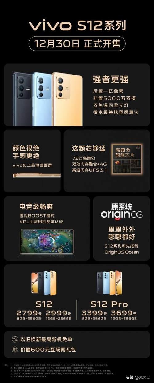 12月30日,vivo S12系列正式开启首销,2799元起。Vivo S12系列主打“全方位出众自然出众”,搭载旗舰芯片,前置高达5000万像素柔光双摄像头,后置1亿像素超清主摄像头,带来全面出色的使用体验。现在购买vivo S12系列,在以旧换新的支持下,可以免费享受新机,还可以获得价值600元的互联网礼包。想买的朋友可以赶紧行动了。