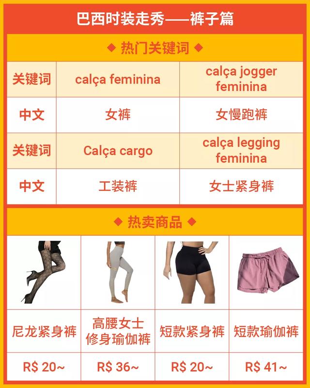 掌握旺季巴西女装的最佳销售时机和需要特别注意的尺码表。下面我们来看看各个细分品类的畅销单品,从上衣到裤子,让我们抓住流行趋势,实现旺季爆款。