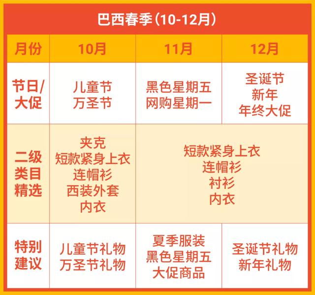 巴西的季节和我们的相反。10月,它们开始进入春天,接着是夏天。巴西市场的卖家可以开始准备春夏流行趋势,提前上架当季新品。