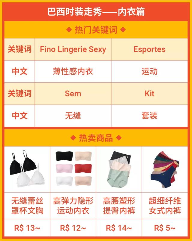 内衣产品在巴西市场也很受欢迎,卖家朋友们可以多关注一下这些产品。除此之外,卖家朋友还需要注意巴西女生的身材特点,提供量身定制的尺码表尤为重要。