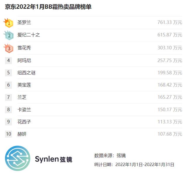 根据电商数据搜索工具“串镜”的数据,2022年1月,JD.COM平台位列BB霜畅销品牌榜第一,销售额为761.33万元。第二名是艾吉20,销量615.87万元。第三届雪花秀,销售额303.1万元。从第四名到第十名分别是阿玛尼、新西兰之谜、美宝莲、、卡姿兰、华、。