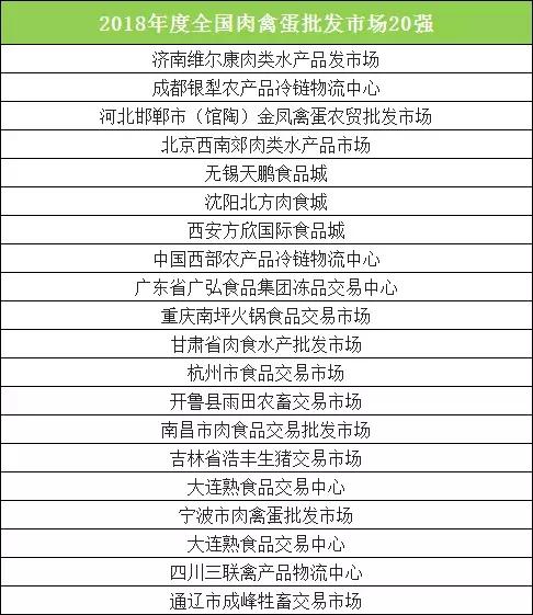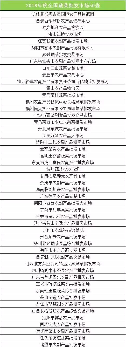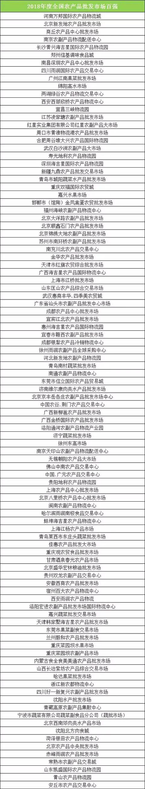 根据成交额,评选发布了以下榜单:2018年全国农产品批发市场百强、2018年全国农产品批发市场50强、2018年全国蔬菜批发市场50强、2018年全国水果批发市场20强、2018年全国水产品批发市场30强、2018年全国肉禽蛋批发市场20强、2018年全国粮油批发市场20强、2018年全国茶叶批发市场10强、具体列表如下(点击图片看大图看清楚):