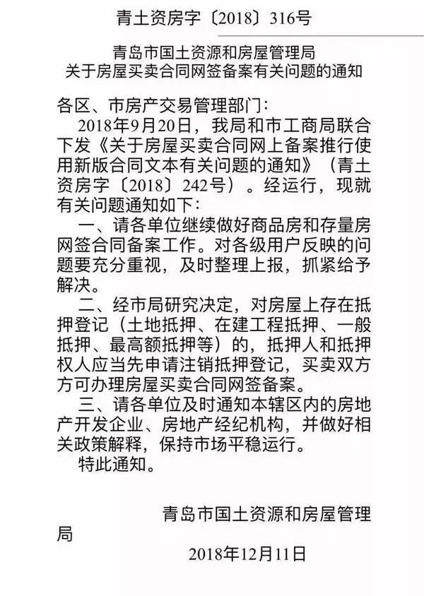 近日,青岛市国土资源和房屋管理局发布《关于房屋买卖合同网上签约备案有关问题的通知》,其中提到,房屋上有抵押登记的,抵押人和抵押权人应当先申请注销抵押登记,买卖双方均可申请房屋买卖合同网上签约备案。