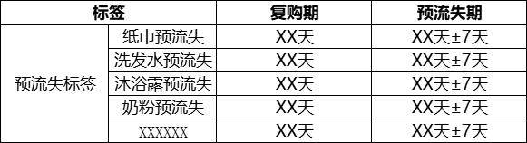 预亏标签是指根据产品的回购期,将回购日前后一周设定为预亏期,给用户贴上标签后,便于运营商进行精准的回购营销;这组标签非常适合品类回购周期稳定的产品,如纸巾、洗发水、净化器等易耗品,以及汽车、手表、昂贵的服务帽等。,哪些需要定期保养,都可以用。