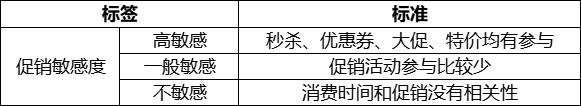 顾名思义,这种标签意味着用户对推广活动是否敏感。原理是用户在促销期间购买产品的频率和金额越高,用户的促销敏感度越高;这类标签的目的是为了筛选出那些在活动中容易“剁手”的用户。每次有新品和促销,都能给予更多的触动,用户的转化效果会更好。对于那些不敏感的用户,尽量不要给予过度营销。结合RFM模式,当他们成为用户时,给予接触会更好。