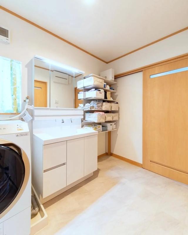 很多人会把洗衣机安排在卫生间,可以借鉴日式住宅,扩大洗脸台干燥面积空,改造成烘干房。