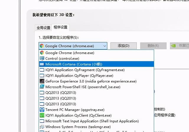 3.接下来点击左侧菜单栏中的“管理3D设置”,点击程序设置,通过下拉找到并点击选择要高性能运行的游戏。