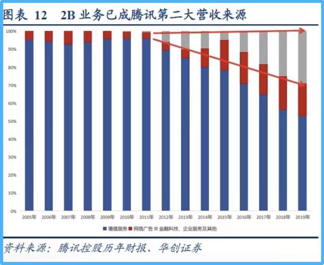 腾讯曾经被认为是以To C产品见长的互联网公司,也因此积累了庞大的用户群。尤其是游戏领域,这个板块的收入一度占据总收入的半壁江山。多年来,腾讯一直在努力摆脱“老”的帽子,寻求多元化的收入结构。随着公司全面拥抱产业互联网,To B业务收入逐渐成为支撑这艘巨轮掉头的重要引擎。