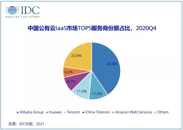 今年4月,IDC最新发布的《全球及中国公共云服务市场跟踪(2020)》报告显示,2020年第四季度,中国IaaS市场规模为34.9亿美元,阿里巴巴(40.6%)仍占据市场份额第一的位置,华为市场份额已达11%,与腾讯并列第二。