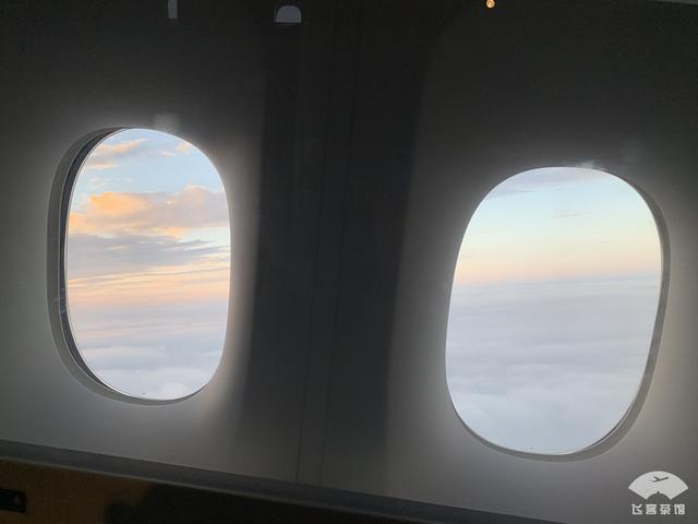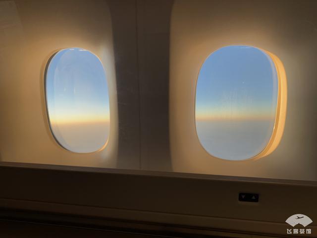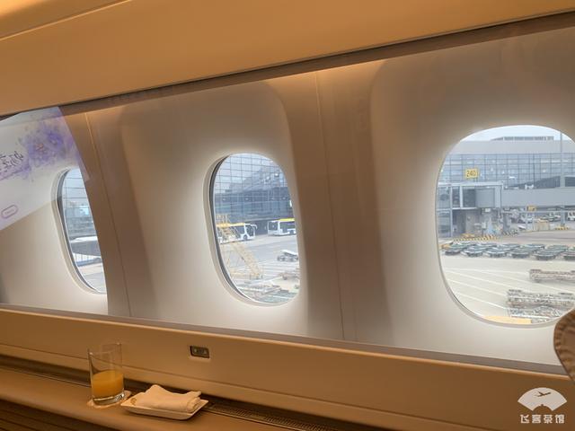 1-2排的豪头可以独享三排窗户,百叶的设计也和后来的商务经济不一样。它是电控的,总共有两个档位。优点是可以完全遮挡光线(不像787是利用物理原理调节亮度,即使是最暗也不能完全遮挡光线)。缺点是因为外面加了一层玻璃,反射是不可避免的,大大影响照片质量。