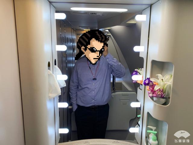 郝的另一个boss起飞后一直在睡觉。前舱的两个cc干完活,过来和我聊了一会儿。他们看到我在拍照,特意把头等舱的储物柜放在装饰品上,让我拍照。这个储物柜在国内航线上简单的用鲜花装饰,在洲际航线上用零食和饮料装饰。