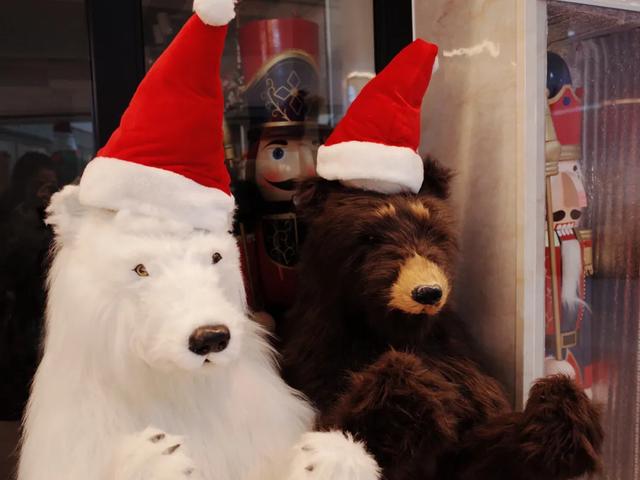 北极熊还带了一只非常爱吃三文鱼的同伴——阿拉斯加棕熊,一起庆祝节日。在拥有圣诞帽这件事上,人类并不高人一等,戴帽子的可爱输给了动物。