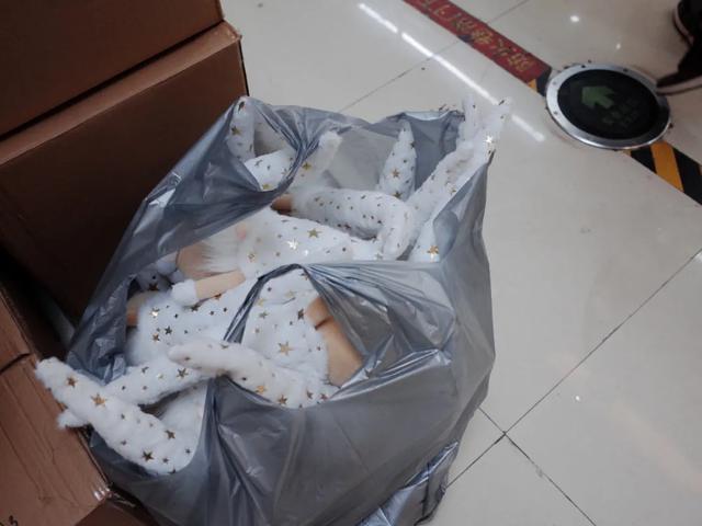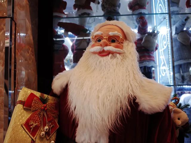 一个商家在门口用塑料袋包裹圣诞老人的腿。难道是因为长期在冰天雪地里行动,这位可爱的大胡子爷爷“腿冷”,需要保暖?